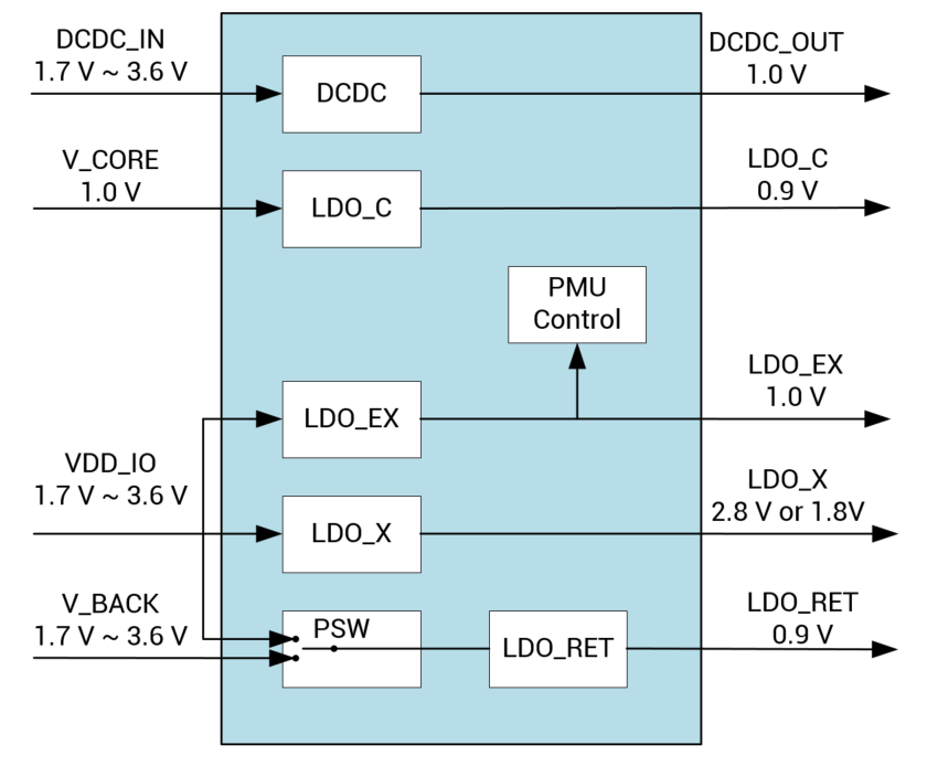 | DCDC_OUT | 內部DC/DC轉換器的輸出電壓, 外接電感及濾波電容,提供1.0V供電。 建議電感值1uH,建議電容值10uF。 | 0.95 | 1.0 | 1.05 | V |