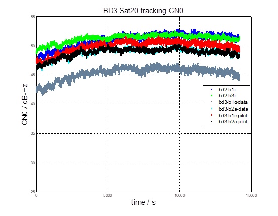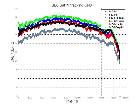 第19和20號衛星信號CN0圖如下,包括了現有北斗系統B1i和B3i信號以及 北斗3衛星播發的新體制信號:B1C (包含B1C-data和B1C-pilot)和B2a(包含2a-data和B2a-pilot):